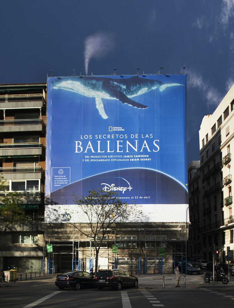 Creada por Havas, la lona de Disney + tiene casi 500 metros cuadrados de superficie y unas dimensiones aproximadas a las de un cetáceo (18 metros de largo), suelta un chorro de agua reciclada vaporizada a presión, simulando la respiración real de las ballenas. El agua de la instalación, que proviene de agua de lluvia, humidificará las plantas de la comunidad de vecinos en un área específicamente designada en el edificio para reaprovechar como riego. Además, una vez que finalice la instalación el 4 de mayo, el material utilizado en la instalación se reciclará para producir bolsas que se emplearán en la?recogida de residuos en las playas españolas este verano.