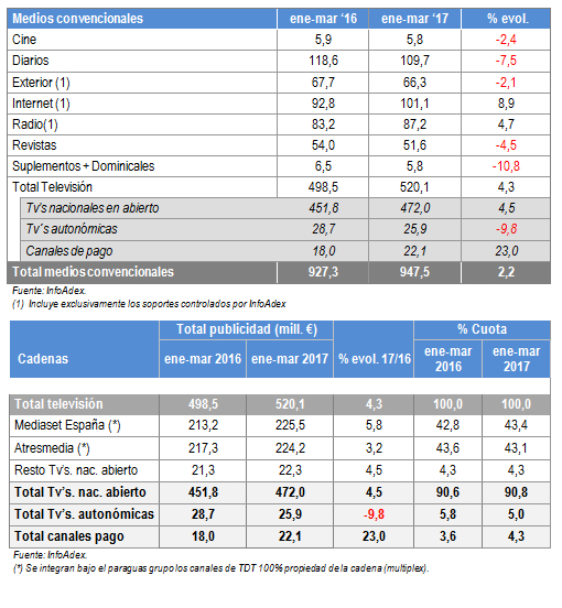 Televisión, que sigue siendo el primer medio por volumen de inversión recibida, creció, según InfoAdex, un 4,3%, con lo que alcanzó los 520,1 millones de euros en los primeros tres meses del año. “Diarios, segundo medio por su valor absoluto de inversión publicitaria”, señala infoAdex en la nota de presentación de sus datos, “ha sufrido en el período enero-marzo de 2017 una caída del -7,5%, quedándose en una inversión de 109,7 millones de euros.