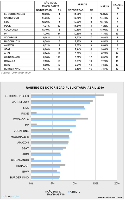 Aunque los tres primeros puestos siguen igual que el mes pasado, con El Corte Inglés, Carrefour y Lidl encabezando el ranking, las elecciones generales han hecho que tres marcas de distintos partidos politicos se cuelen este mes.