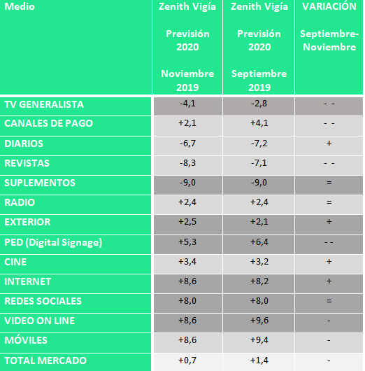 Una situación que podría reproducirse en 2020, estiman, con un crecimiento previsto del 0,7%, sustentado en los medios digitales, mientras que la televisión generalista y los medios impresos seguirán perdiendo fuerza.