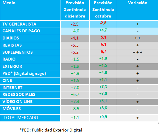 La previsión de Zenthinela para los medios no convencionales se sitúa en un crecimiento del 1,1%, con lo que el montante para el conjunto de los medios (convencionales y no convencionales) es también de un 1,1%, con 12.872 millones de euros.