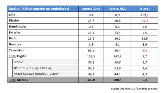 Durante el mes de julio, la inversión publicitaria ha alcanzado la cifra de 424,1 millones de euros, lo que supone un descenso del 3,4% respecto al mismo mes de 2021. Tras ello, en agosto la inversión publicitaria para el conjunto de medios convencionales se mantuvo relativamente estable respecto al mismo mes de 2021. InfoAdex cifra en 300,8 millones de euros el montante manejado, lo que supone un 0,3% más que el mismo periodo del año anterior. Si se analiza la evolución de la inversión en los dos meses de verano, se observa que de agosto a julio ha habido una caída del 29%, lo que supone unos 123,3 millones euros menos que la cifra manejada en julio,