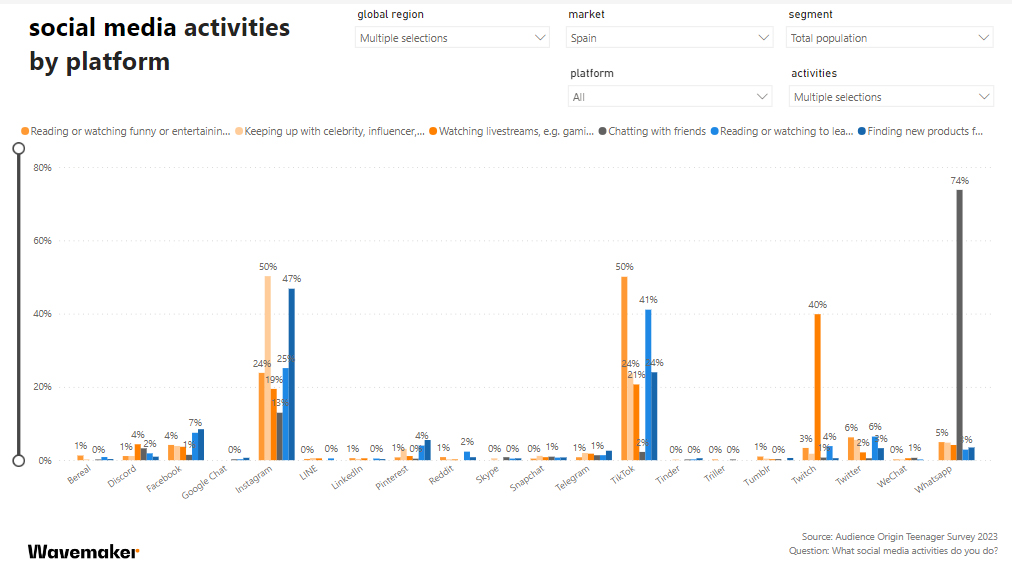 Whatsapp es la red social utilizada por los adolescentes españoles para chatear con amigos (74%), TikTok es utilizada para leer o ver cosas sobre las que aprender (41%), Instagram para estar en contacto y coger ideas de celebrities, influencers y demás creadores de contenido (50%), así como para encontrar nuevos productos (47%), mientras que Twitch es la red social favorita para seguir livestreams de gamers y otros influenciadores.