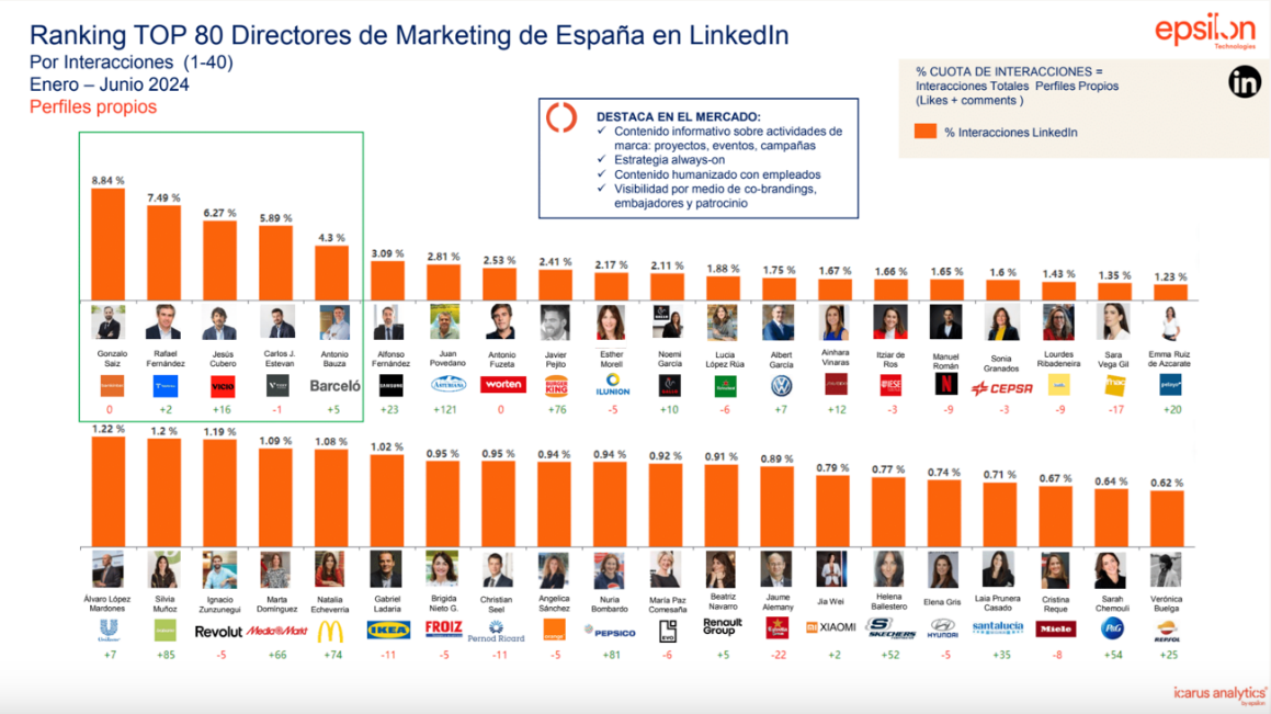 Tras analizar la actividad en LinkedIn de más de 235 directores de marketing de los sectores de Gran Consumo, Retail, IBEX35, Banca, Seguros, Moda, Automóvil y Belleza entre enero 2023 y enero 2024, Epsilon Technologies ha dado a conocer, junto a la Asociación de Marketing de España (AMKT) el ranking con los directores de marketing más influyentes y con mayor actividad en LinkedIn.