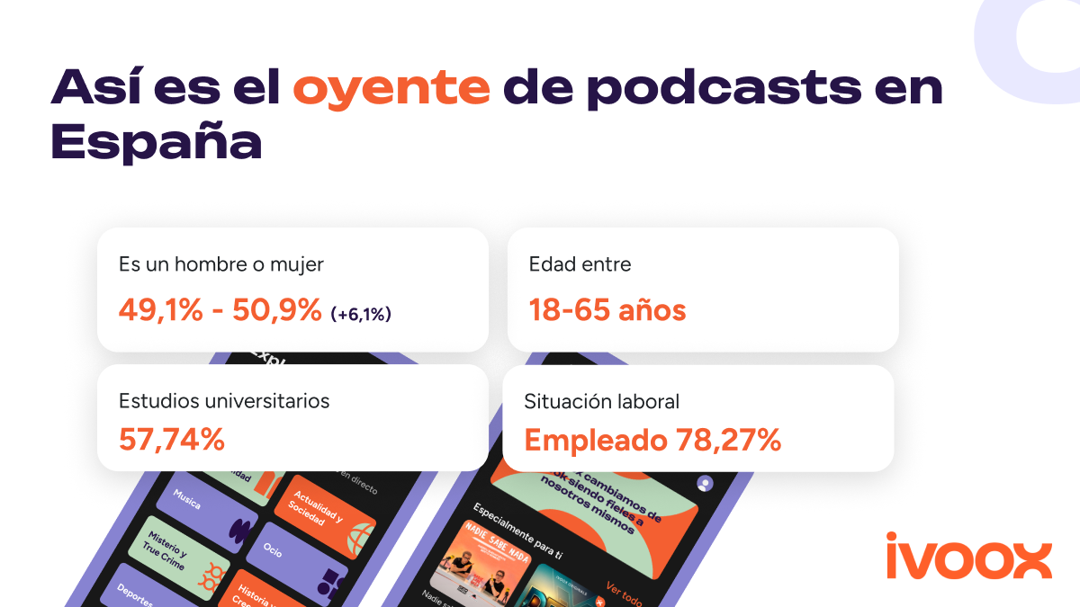 El perfil del oyente también ha evolucionado: el 50,9% son mujeres, logrando una distribución paritaria. La mayoría tiene entre 18 y 65 años, estudios universitarios (57,7%) y se encuentra en situación laboral activa (78,3%). El móvil es el dispositivo principal de escucha (96,6%) y los momentos preferidos son por la mañana y por la noche durante los días laborables.