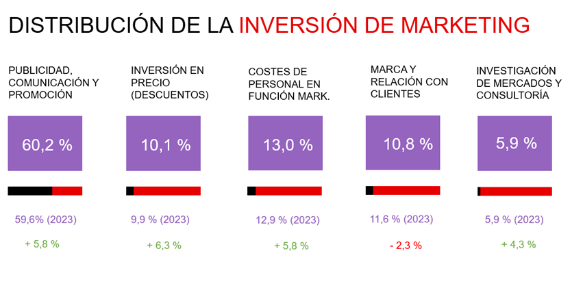 El mayor peso de la inversión corresponde a la categoría de Publicidad, Comunicación y Promoción, que suma 20.159,7 millones de euros (60,2 % del total), con un crecimiento del 5,8 %. Le siguen los Descuentos de Precio, con 3.369,8 millones (10,1 %), que protagonizan el mayor aumento porcentual (6,3 %), impulsados por sectores como automoción y gran consumo.