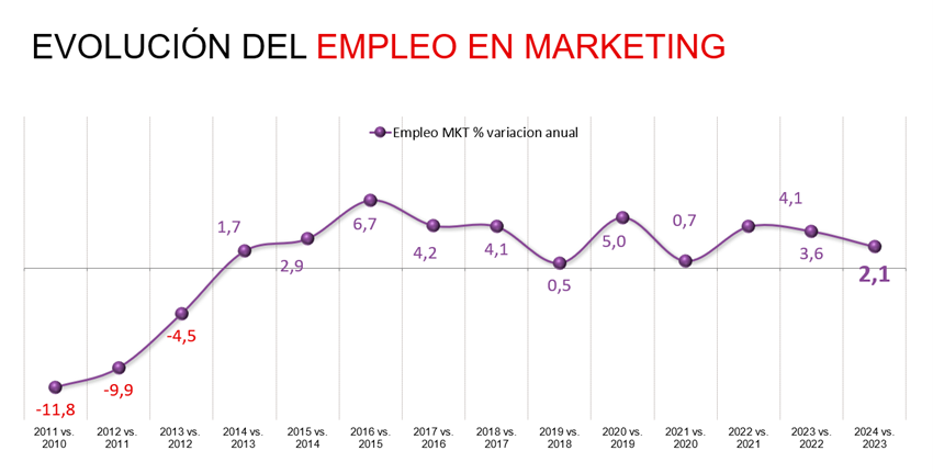 El número de empresas con más de 10 empleados y facturación superior al millón de euros creció un 2,55 %. El empleo en funciones de marketing aumentó un 2,1% y los salarios del sector subieron un 1,96 %, alcanzando los 4.363,7 millones de euros en remuneración.