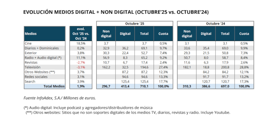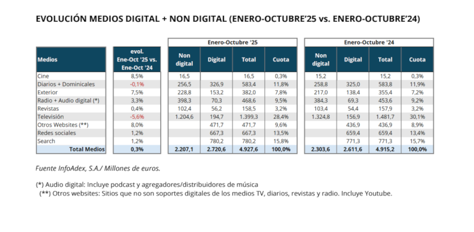 La inversión publicitaria en los diez primeros meses del año se sitúa en 4.927,6 millones de euros, lo que representa un ligero avance del 0,3% en comparación con el mismo periodo de 2024, cuando alcanzó los 4.915,2 millones. Como se recordará, en los nueve primeros meses del año la evolución se había mantenido plana.