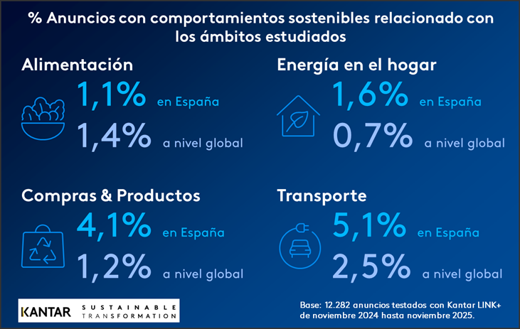 Los datos confirman que las marcas españolas destacan especialmente en la comunicación de hábitos responsables vinculados a la vida cotidiana. En concreto, España supera ampliamente la media global en ámbitos como las compras y productos (4,1% vs. 1,2%; +2,9 puntos), transporte (5,1% vs. 2,5%; +2,6 puntos) y energía en el hogar (1,6% vs. 0,7%; +0,9 puntos), lo que evidencia una sensibilidad creciente y ya consolidada hacia la sostenibilidad en la estrategia creativa de las marcas.