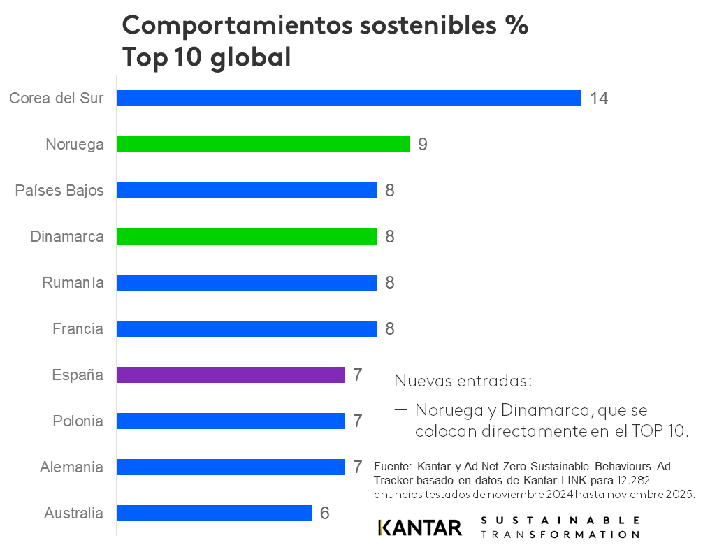 España ha cerrado 2025 reforzando su posición como uno de los mercados más comprometidos con la integración de la sostenibilidad en la publicidad. Así lo refleja el último "Tracking de Comportamientos Sostenibles en Publicidad" elaborado por Kantar en colaboración con Ad Net Zero, que sitúa al mercado español en la séptima posición del ranking global.
