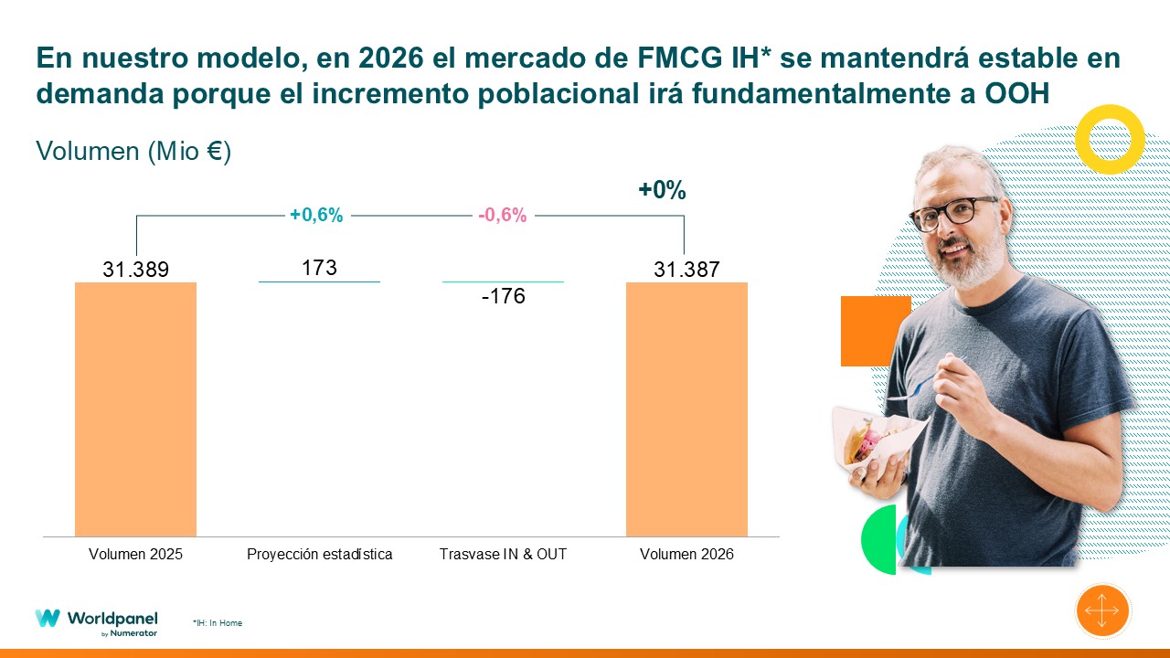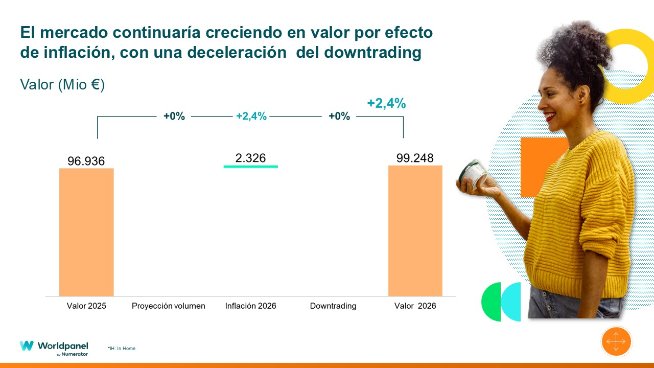 El mercado de gran consumo afrontará 2026 con una evolución plana en volumen y un crecimiento en valor cercano al 3%, impulsado principalmente por el efecto de la inflación, según el informe "Los grandes retos de 2026", elaborado por Worldpanel by Numerator. Aunque en 2025 se produjo un ligero repunte del consumo en volumen, del 0,6%, las previsiones apuntan a que esta evolución se repetirá en 2026 y se concentrará, en gran medida, en el consumo fuera del hogar. La inflación seguirá empujando el crecimiento del mercado en valor, mientras los hogares asimilan progresivamente la nueva realidad de precios.