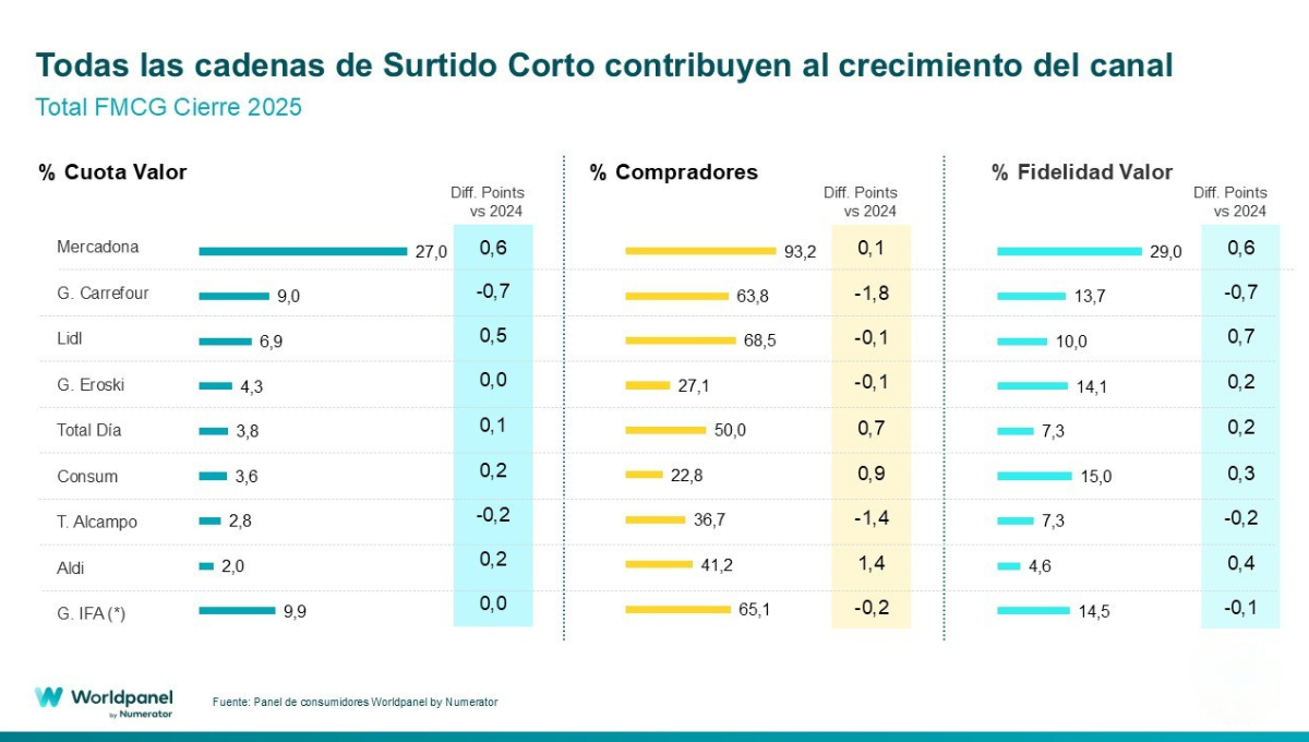 Lidl sigue creciendo y está ya en el 6,9% de cuota, consolidándose como una opción para realizar la “cesta completa” entre sus clientes, donde el desarrollo de su tarjeta de fidelización gana relevancia; mientras que Aldi ha sido una de las grandes protagonistas del año y está ya en el 2%, siendo además la cadena que más ha crecido en compradores durante 2025, un 1,4 p.p., mejorando también en frecuencia de compra y en percepción de precio.