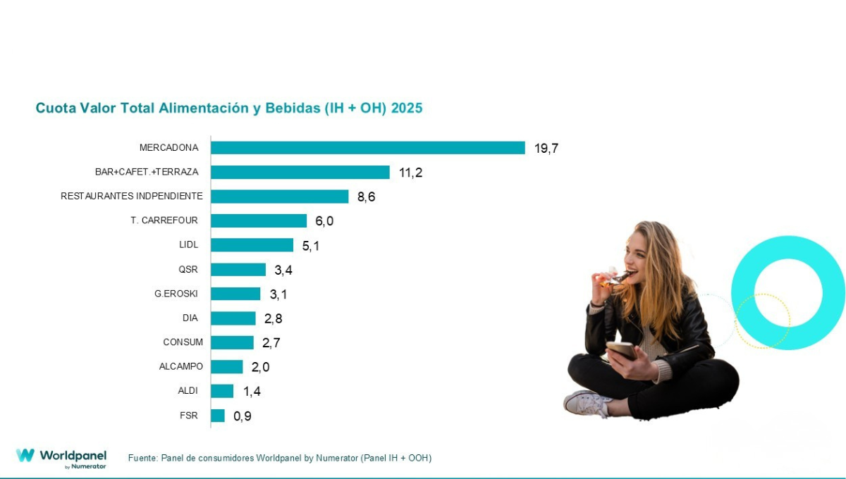Además, al sumar la alimentación tanto dentro y fuera del hogar, Mercadona lidera con un 19,7% en valor, superando a segmentos como bar+cafetería+terraza con el 11,2%, el restaurante independiente con el 8,6% y retailers como Carrefour y Lidl, que cierran el top 5 con el 6% y el 5,1%, respectivamente.