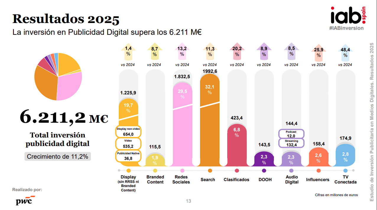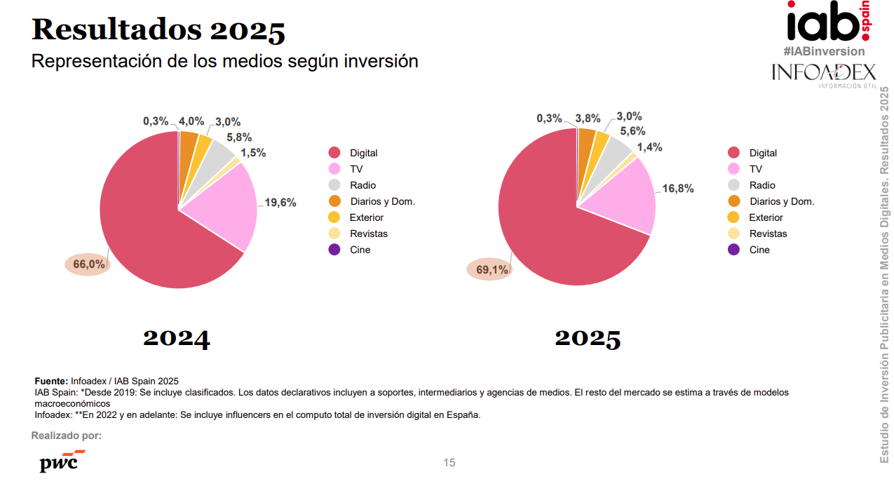El mercado digital cerró 2025 con un volumen de inversión de 6.211,2 millones de euros. Esta cifra supone un crecimiento interanual del 11,2% respecto a 2024 y un incremento acumulado del 24,8% frente a 2023, “consolidando una tendencia expansiva sostenida en los últimos ejercicios”, señalan los promotores del Estudio de Inversión Publicitaria en Medios Digitales, presentado ayer por IAB Spain, en colaboración con PwC. Así, indican, el entorno digital concentra ya el 69,1% de la inversión publicitaria total en medios en España. En 2003, puntualizan los responsables del informe, la inversión publicitaria digital en España apenas alcanzaba los 72,6 millones de euros.