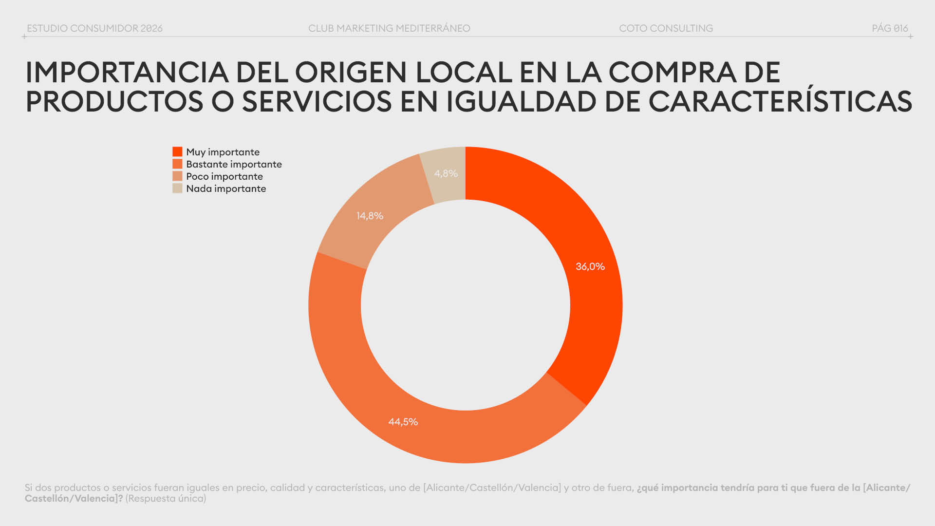 El 80,5% de los consumidores de la Comunidad Valenciana se decanta por productos y servicios de la “terreta” a la hora de comprar en igualdad de precio y calidad, ya que considera bastante o muy importante que el producto sea local. Este dato confirma que la proximidad no solo se valora, sino que puede inclinar la decisión final de compra. El origen o procedencia de la marca es un aspecto valorado por los consumidores valencianos que toma mayor importancia cuando la marca se siente “próxima”. Así, para más del 70% de los encuestados es importante o muy importante la procedencia nacional, autonómica y provincial.