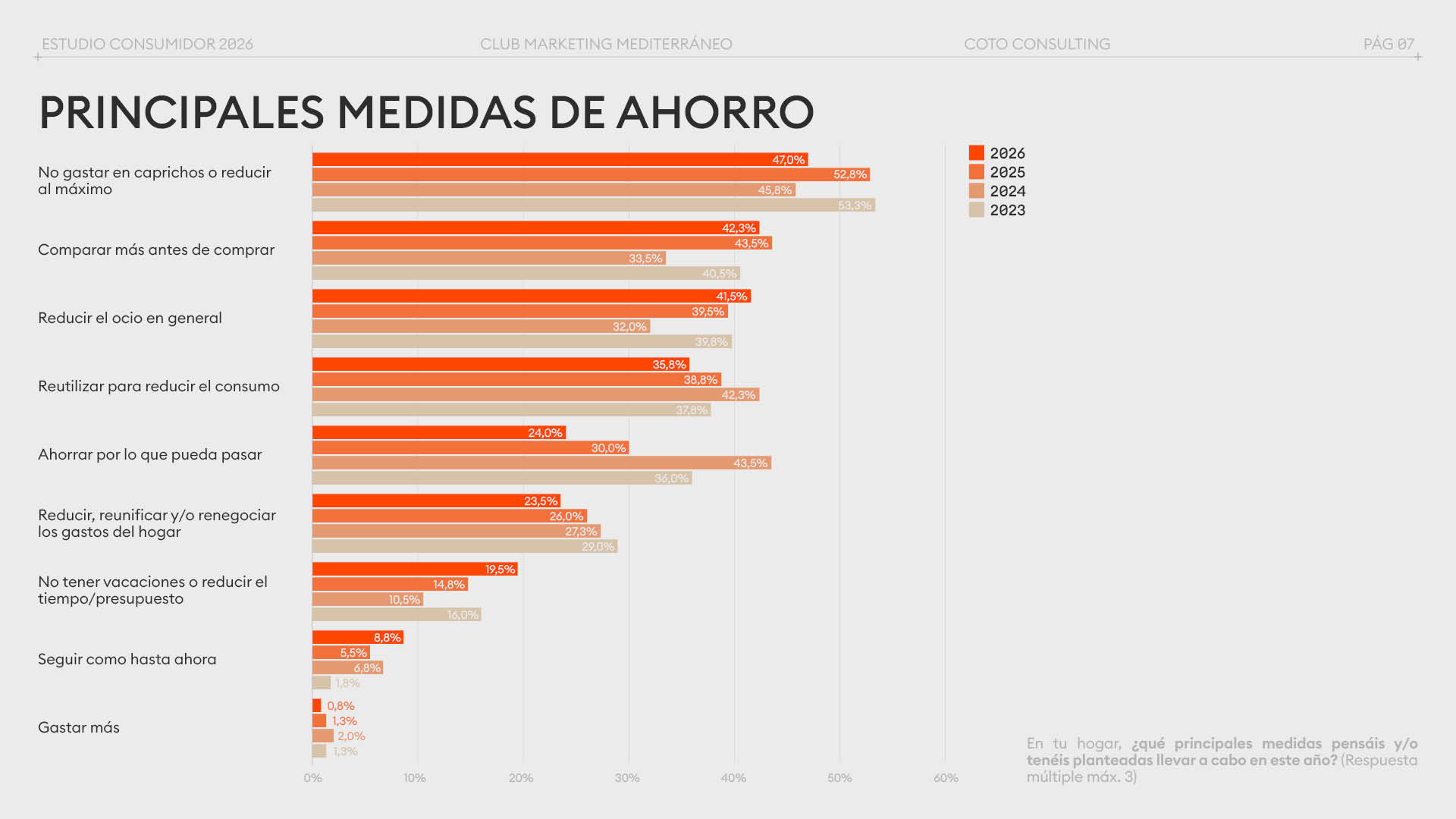 En cuanto a las medidas de ahorro, el informe destaca que este 2026 no es un año de recortes severos, pero se consolidan comportamientos racionales y selectivos entre los que destaca no gastar en caprichos (47%), reducir el gasto en ocio (41,5%) o comparar más antes de comprar (42,3%). El ocio vuelve a ser la principal variable de ajuste presupuestario. Así, el 90,4% de los hogares encuestados prevé aplicar medidas de ahorro durante 2026.