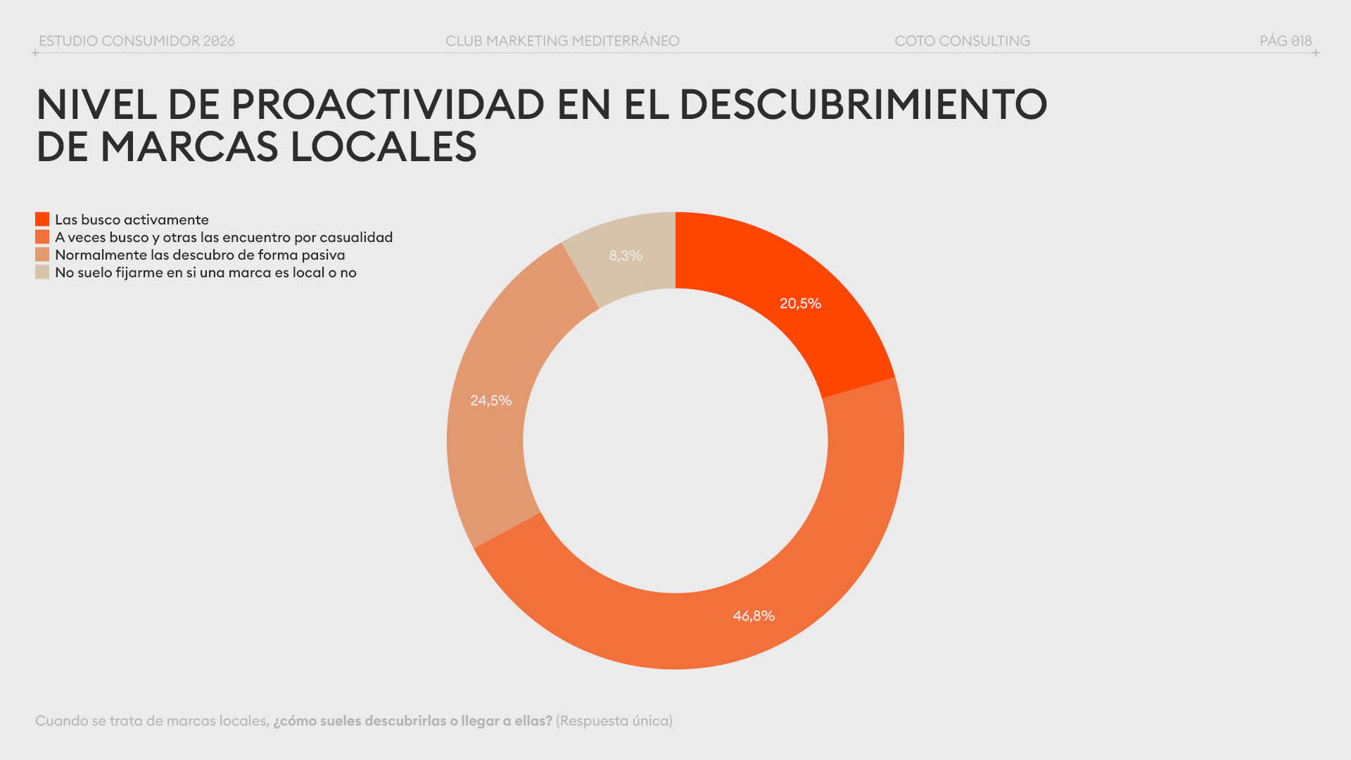 De acuerdo a este estudio, el 46,8% de los encuestados destaca que no siempre tiene el mismo comportamiento respecto a las marcas locales, a veces las busca y otras las encuentra por casualidad. No obstante, un 20,5% afirma buscarlas activamente.