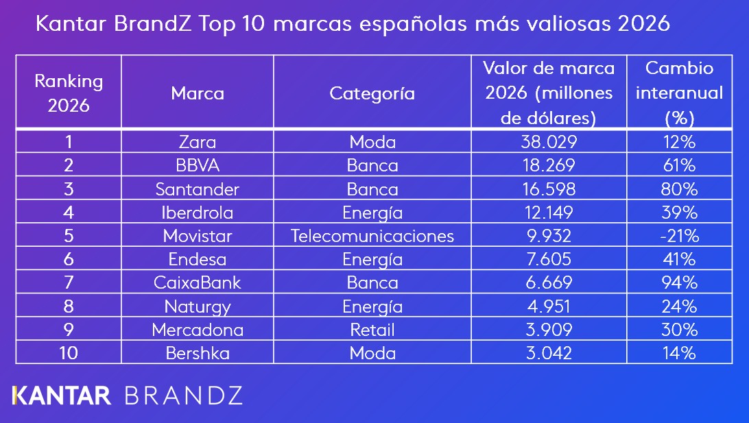 Las marcas de la categoría de banca siguen siendo un pilar fundamental del ranking de las marcas españolas: en 2026 nueve marcas concentran un tercio del valor total del ranking. BBVA, segunda en el ranking, ha incrementado su valor de marca un 61%, hasta alcanzar los 18.269 millones de dólares. Este banco, con orígenes que se remontan a 1857, es percibido por los consumidores como innovador y vanguardista.