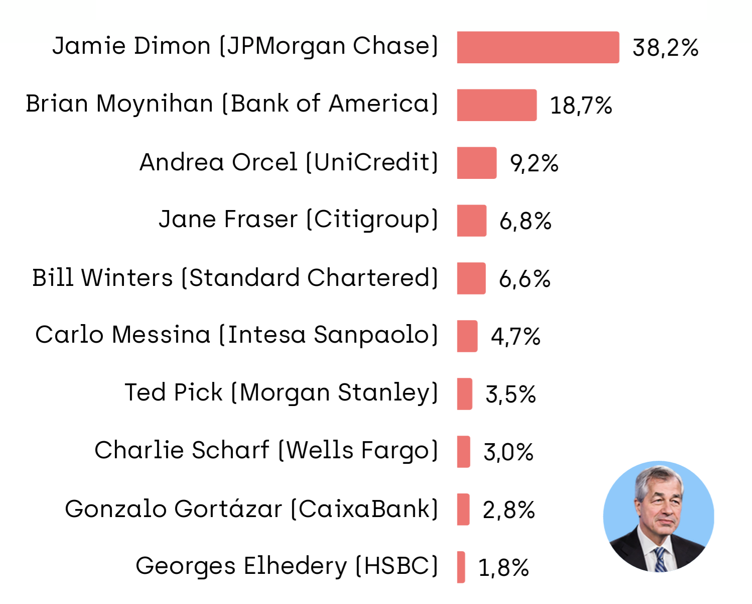 El ranking lo lidera Jamie Dimon, de JPMorgan Chase, con un 38,2%. Le siguen Brian Moynihan, de Bank of America (18,7%), y Andrea Orcel, de UniCredit (9,2%). También figuran en los primeros puestos Jane Fraser (Citigroup), Bill Winters (Standard Chartered), Carlo Messina (Intesa Sanpaolo), Ted Pick (Morgan Stanley), Charlie Scharf (Wells Fargo) y Georges Elhedery (HSBC).