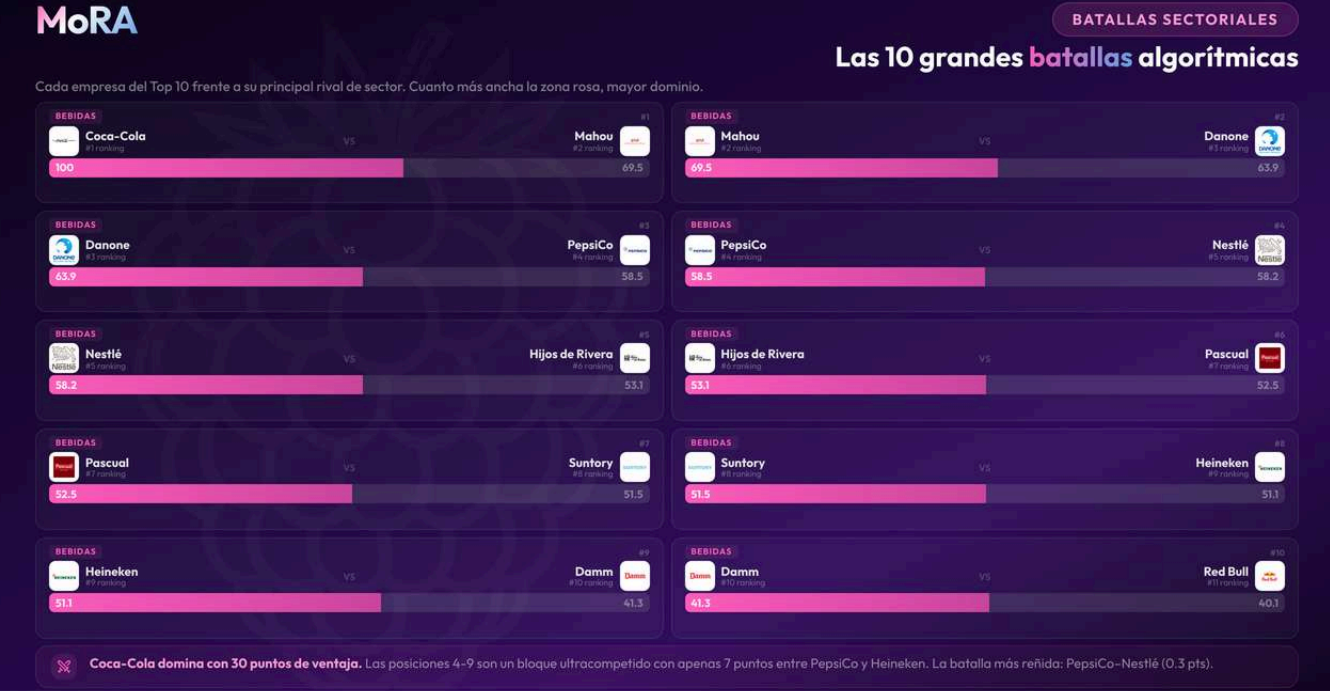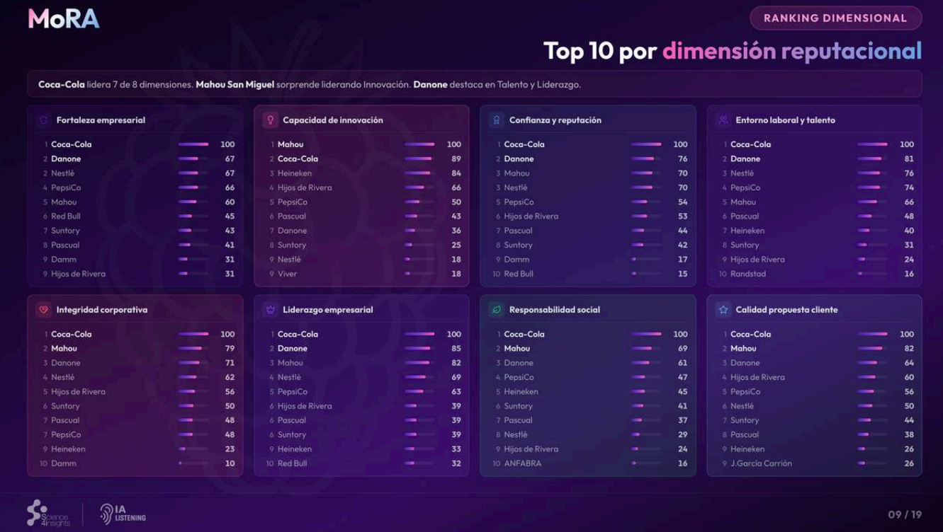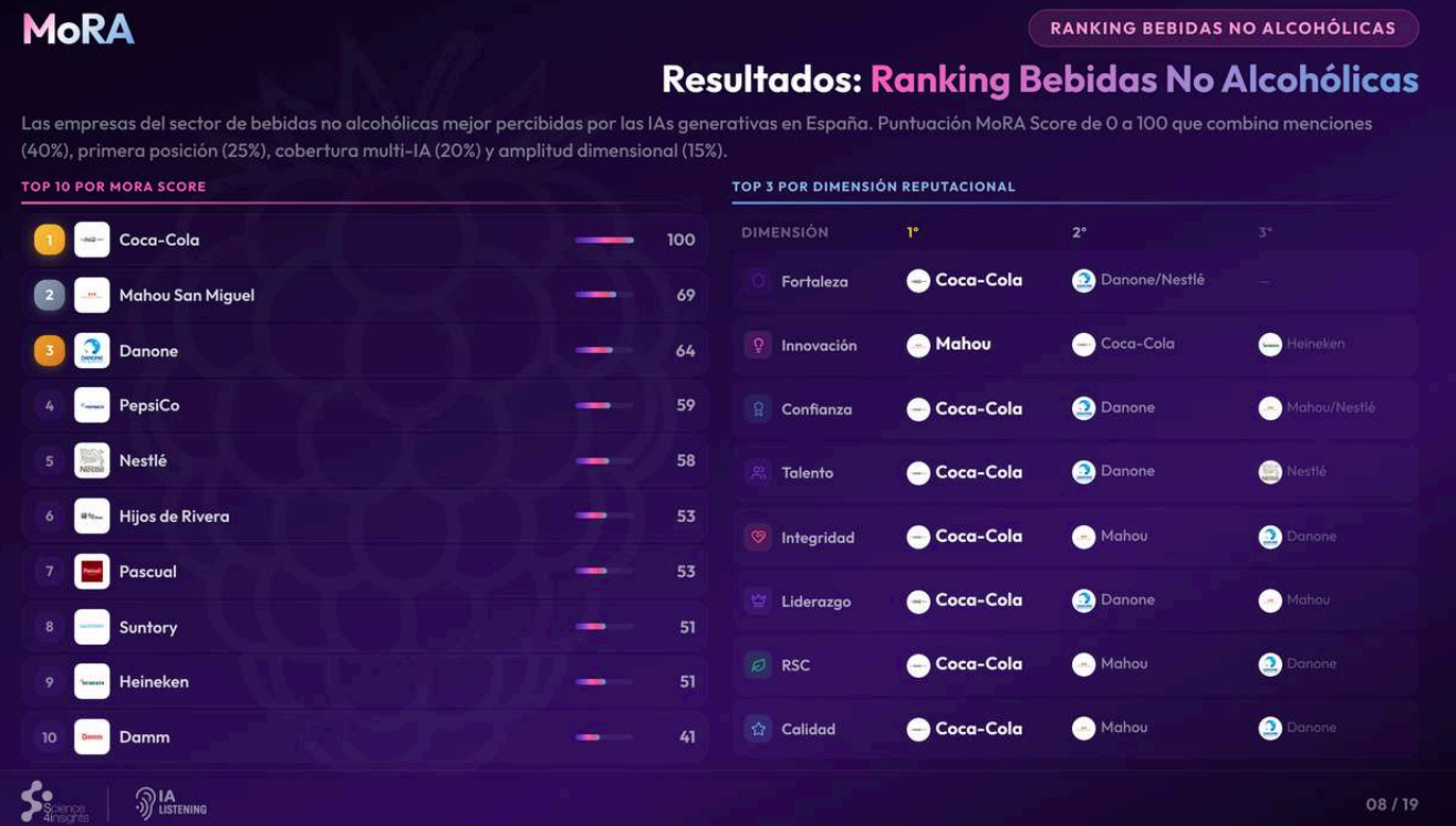 La clasificación final del estudio sitúa a Coca-Cola en primer lugar, con liderazgo en siete de las ocho dimensiones evaluadas (Fortaleza empresarial, Calidad, Entorno laboral y Talento, Integridad corporativa, Liderazgo empresarial, Confianza y Responsabilidad social); Mahou San Miguel en segundo lugar, única empresa que arrebata a Coca-Cola el liderazgo en la dimensión de Innovación; y Danone en tercero. Completan el top 10: PepsiCo (4), Nestlé (5), Hijos de Rivera (6), Pascual (7), Suntory (8), Heineken (9) y Damm (10).