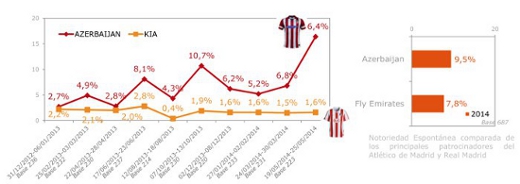 Esta situación indudablemente ha generado consecuencias positivas —además de las deportivas— desde la perspectiva del marketing. Lo demuestra, por ejemplo, el mayor conocimiento de su principal patrocinador (Azerbaijan), quien ha experimentado un claro incremento de las menciones en espontáneo recogidas en el Tracking IOPE una semana antes de la finalización de la liga, alcanzando un 16% de la población (menciones totalmente espontáneas al preguntar por los patrocinadores del Atlético de Madrid).