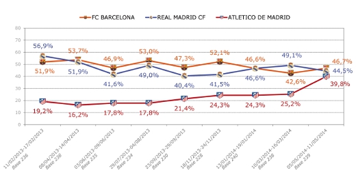 El crecimiento del conocimiento de la marca Azerbaian es sin duda resultado de una mayor presencia mediática del equipo que patrocina, pero también de un claro incremento de seguidores y aficionados. Esta situación se muestra evidente si analizamos la evolución del indicador espontáneo de admiración de equipos de fútbol incluido en el Tracking IOPE de TNS. En este sentido vemos como la admiración hacia el Atlético de Madrid ha llevado una clara tendencia creciente desde comienzos del 2013, situándose en el mes de mayo de 2014 prácticamente al mismo nivel que Real Madrid y Barcelona a nivel Nacional.