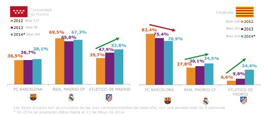 En la Comunidad de Madrid, al analizar la evolución por años de la admiración generada por el Barcelona, Real Madrid y Atlético de Madrid, se evidencia aun más esta buena tendencia del Atlético de Madrid, que obtiene en 2014 un porcentaje de admiración 13 puntos más alto que en 2012, siendo el único equipo con una clara tendencia creciente.