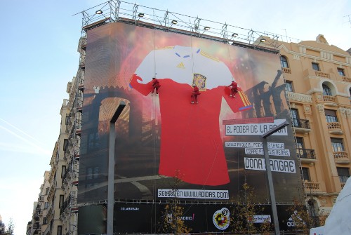Varias unidades móviles de la Cruz Roja y un hospital de campaña recogieron las donaciones de todos los que se acercaron hasta allí. Una gran lona de 18 metros mostraba la nueva camiseta Adidas de la selección española, aunque de color blanco… Según se iban recibiendo donaciones unos rapelistas iban rellenado de rojo la zamarra española hasta devolverle su rojo original.