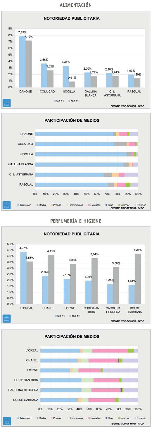 En el caso de Perfumería e Higiene, que recupera valores normales tras el punto culminante de las navidades, la marca líder en notoriedad, L´Oréal, apenas sufre variación de un año a otro. Prácticamente lo mismo ocurre con el resto de marcas, aunque hay que anotar la salida de Armani y la entrada de Loewe, además en un tercer puesto. En este sector también se abre el abanico de medios, aunque en este caso es a costa de revistas y dominicales, en lugar de televisión, y el principal beneficiado es exterior.