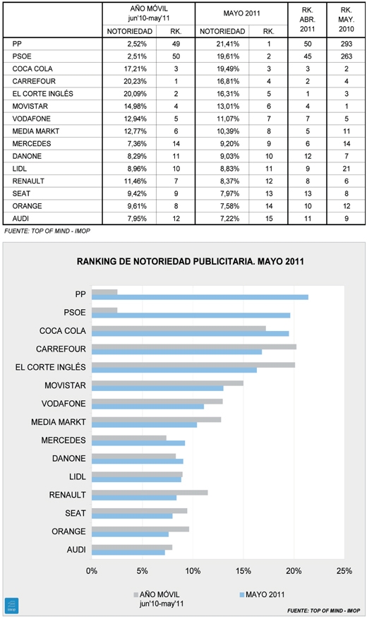 Por detrás, el ranking se trastoca mucho. Coca-Cola está más o menos como hace un año, pero en Carrefour y El Corte Inglés se ven respuestas distintas a la situación: la primera sube y la segunda baja. Lo mismo ocurre con Movistar, que en mayo de 2010 estaba en pleno relanzamiento, y Vodafone, que sube incluso sobre abril. Mercedes sigue desde el mes pasado en posición de privilegio en su sector.