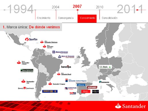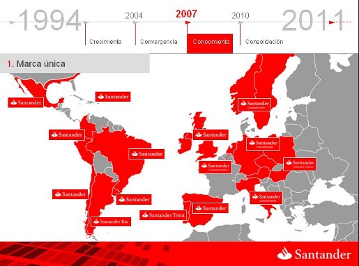 Santander fijó 2007 como tope para culminar esta maniobra. Desde entonces, el banco gestiona de forma integrada toda su labor de marketing, desde la marca única hasta un código de comunicación común o patrocinios corporativos.