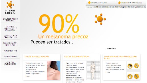La página “Myskinchek” es una plataforma desarrollada por un conjunto de dermatólogos en la que el usuario puede responder una serie de preguntas sobre su tipo de piel y recibir al instante consejos personalizados. El objetivo de la página es generar conciencia acerca de la importancia de prevenir el cáncer de piel. Asimismo, la página informa sobre cómo realizar sesiones de exploración periódicas y aporta datos para conocer posibles patologías dermatológicas.