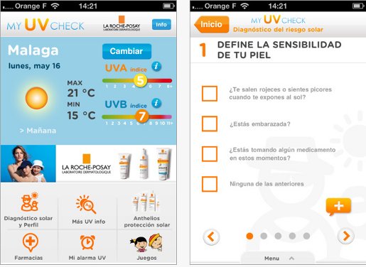 Por otro lado, la aplicación “My UV Check” ha sido diseñada como complemento de la página web. Entre sus funcionalidades destacan la programación de alarmas para que el usuario se vuelva a aplicar protector solar, un sistema de consulta para saber qué nivel de protección requiere cada persona y una opción para conocer cuánta fuerza tiene el sol en cada momento. También cuenta con otros extras, como una herramienta para consultar el tiempo, juegos para los más pequeños, consejos para evitar los riesgos de exponerse al sol a las diferentes horas del día y un localizador de farmacias.