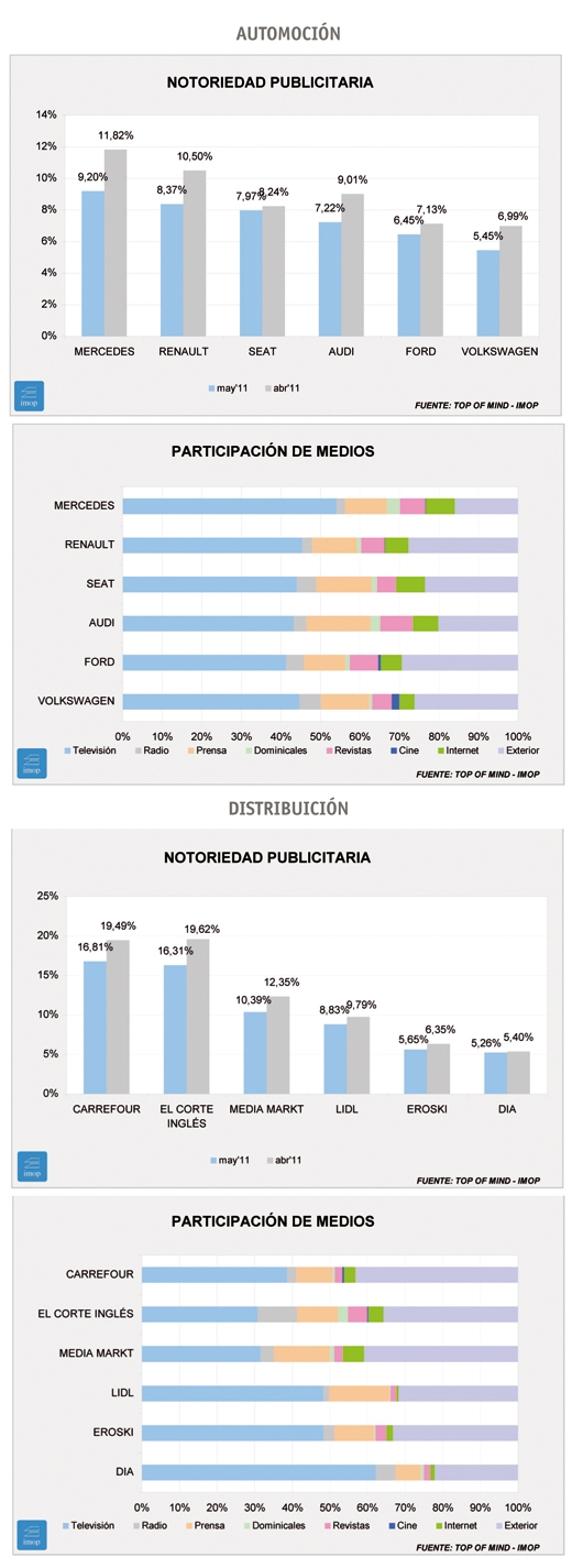 En cuanto a Distribución o Grandes Almacenes, como lo llama Imop, la bajada ligeramente mayor de El Corte Inglés permite a Carrefour subirse al liderazgo. Como en Automoción, las bajadas son prácticamente generales. Respecto al año anterior también hay una tendencia muy generalizada a recibir más notoriedad desde la televisión. Es curioso señalar que el único cambio que se registra sobre un año antes es el adelantamiento de Carrefour a El Corte Inglés.
