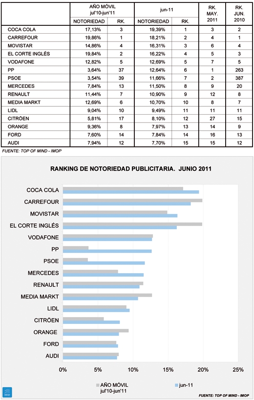 Por empezar por las excepciones, estas las protagonizan (dejando de lado a PP y PSOE), tres marcas de automoción Citroën, Ford y especialmente Mercedes (que sube a los más alto del podium sectorial y pasa del puesto 20 al 8 del global) y una cadena de distribución, Lidl. En las alturas, el liderazgo de Coca-Cola, con un registro algo inferior al del año pasado y pendiente del gran estirón que suele dar en julio. Le basta en cualquier caso para superar a la líder de hace un año, Carrefour, que cae más de cuatro puntos. Por detrás, otro adelantamiento, el de Movistar a El Corte Inglés, que cae a un poco habitual cuarto puesto, por un descenso ligeramente superior al de la operadora. En general, éstas bajan en todos los casos y la que más porcentualmente, Orange, que cae cuatro puestos.