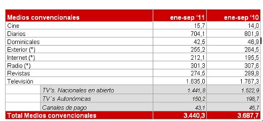 Televisión y Diarios, los dos primeros medios por inversión, siguen siendo los que soportan la mayor parte del recorte, con un descenso del 7,5% y 12,2%, respectivamente, en línea con lo ocurrido en la primera parte del año. Decrecen también Dominicales (9,5%), Exterior (3,5%), Radio (2,1%) y Revistas (5,3%) y sólo ven aumentar su partida presupuestaria el Cine (11,5%) e Internet aunque, en este caso, llama la atención que su incremento está casi cuatro puntos porcentuales por debajo del registrado en los nueve primeros meses, pasando del 12,3% que creció en ese periodo, al 8,5% que registra ahora.