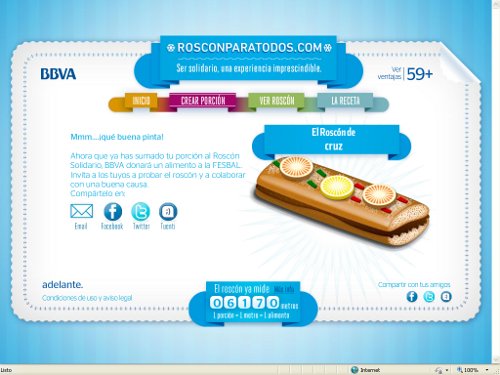 Es el caso de BBVA, que de la mano de la agencia Wunderman, ha lanzado una iniciativa para crear el roscón solidario más grande del mundo. A través de la web www.rosconparatodos.com, los usuarios pueden preparar una porción personalizada y sumarla al roscón para dar forma a esta acción solidaria.