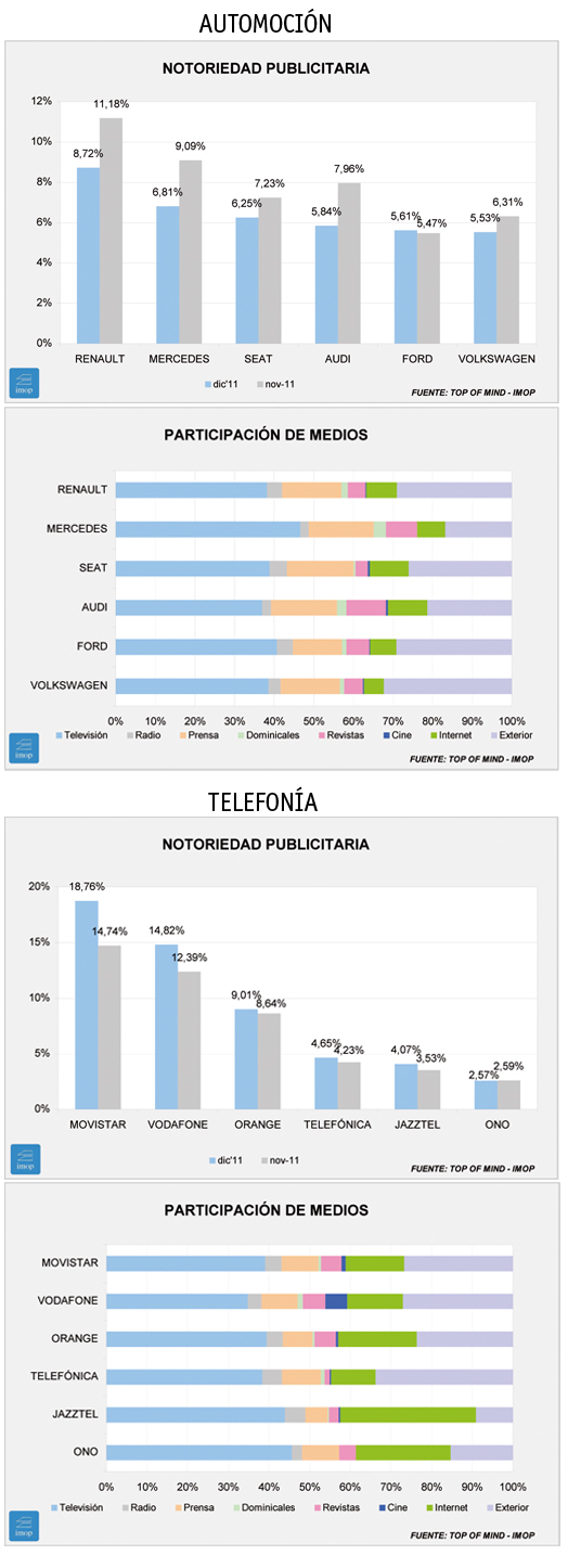 En Telefonía, la guerra entre Movistar y Vodafone se recrudece, lo que hace que ambas ofrezcan unos datos de notoriedad muy por encima de diciembre de 2010. Es algo que no ocurre con el resto de compañías. El único cambio respecto a Diciembre del año anterior es la entrada de Ono y la salida de Yoigo en el último puesto. El crecimiento de la notoriedad de las líderes se consigue a base también de la notoriedad procedente de la televisión.