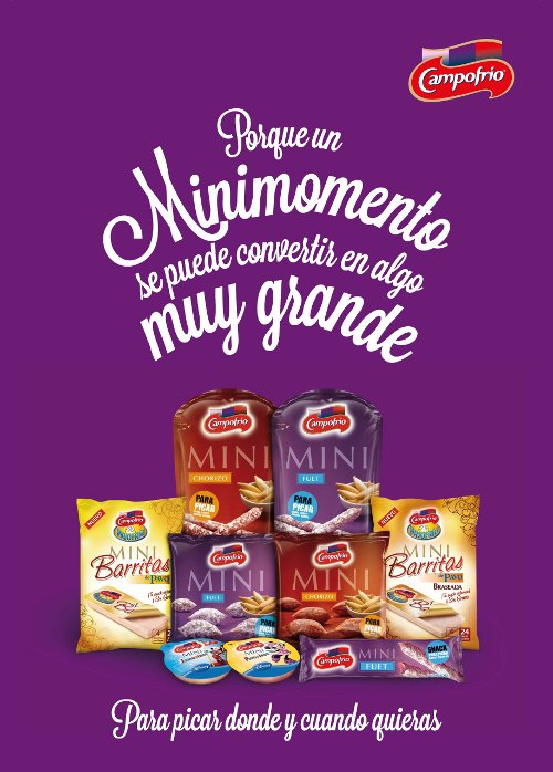 La gama de mini snacks de Campofrío está compuesta por minifuets, mini chorizos, minibarritas de pavo así como los Jamoninos y Pavoninos.
