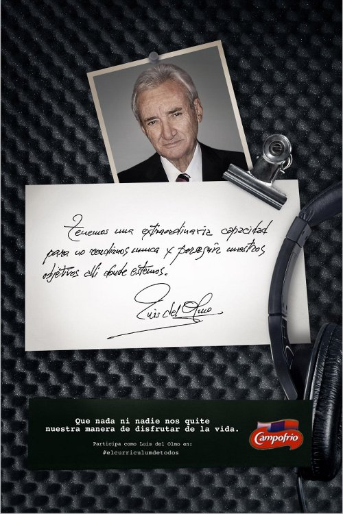 Por su parte, el periodista Luis del Olmo destaca nuestra “extraordinaria capacidad para no rendirnos nunca y perseguir nuestros objetivos allí donde estemos”, animando ambos a los lectores a participar en #elcurriculumdetodos, la iniciativa de Campofrío en redes sociales para contribuir a mejorar nuestra carta de presentación.