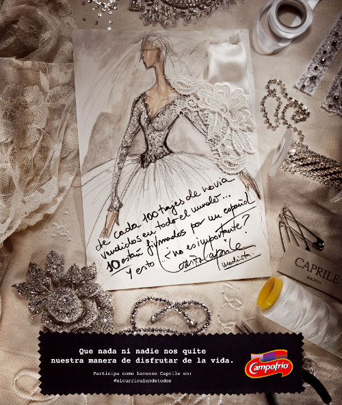 “De cada 100 trajes de novia vendidos en todo el mundo… 10 están firmados por un español. Y esto… ¿no es importante?”, afirma Lorenzo Caprile en el anuncio ilustrado con una de sus creaciones para novias.