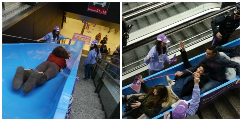 Diferentes personajes, como una limpiadora y un guarda de seguridad estuvieron animando y desafiando a los transeúntes a deslizarse por el tobogán en lugar de bajar andando por las escaleras.
