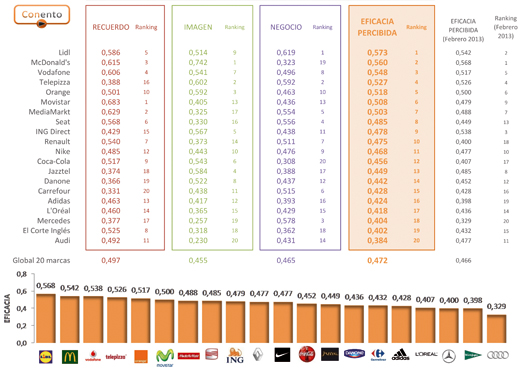 • Con respecto al análisis de los primeros puestos en las tres dimensiones de efiacia, Movistar es primero en el mes de marzo en Recuerdo, McDonald’s en Imagen y Lidl en Negocio.