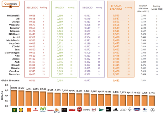 • En el eje de Recuerdo Publicitario lidera el sector de Telecomunicaciones pues entre las cinco primeras marcas de este eje se encuentran Vodafone (1º), Movistar (3º) y Orange (5º). Además este sector también lidera el eje de Imagen, con Orange en 1º lugar, Jazztel en 3º y Vodafone en 5º. Por último, en el eje de Negocio destaca Telepizza sobre el resto de marcas con una importante distancia sobre su inmediato competidor de +0,115.