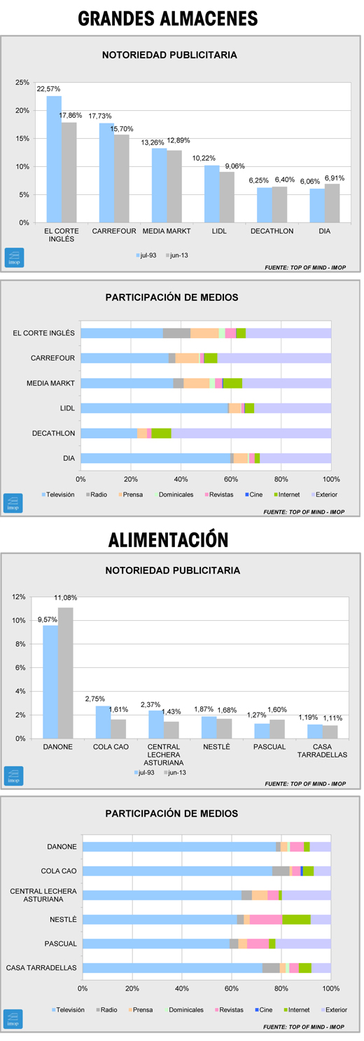 En Alimentación, al contrario, el líder baja cuando casi todos sus alejados competidores crecen. Danone pierde un punto y medio de notoriedad y un poco menos sube el segundo Cola Cao, aunque para esta última porcentualmente se trata de una subida muy superior. La otra marca que pierde notoriedad de estas seis primeras es, muy levemente, Casa Tarradellas. Por medios, destaca la aportación de internet que consigue Nestlé.