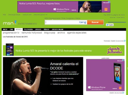 Así, durante los meses de julio, agosto y septiembre, el nuevo dispositivo está patrocinando la Agenda de Conciertos de MSN, a través de una interfaz ad hoc para la página y, sobre todo, de la elaboración de contenido editorial a través de periodistas musicales liderados por Rafa Cervera. Este equipo ha estado realizando una amplia cobertura de los festivales más importantes de nuestro país (FIB, Low Cost, Sonorama y DCode) para MSN. La única condición era que todas las fotografías de sus reportajes debían realizarse con el nuevo smartphone de Nokia.