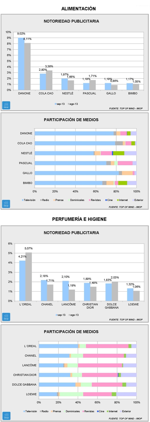 En cuanto a Perfumería e Higiene, las marcas que salen son Olay y Garnier y las que entran Dolce Gabanna y Loewe, en un movimiento ya anticipatorio de la batalla de las navidades. El fenómeno en la cabeza es el contrario que en Alimentación, con una subida de L´Oréal sobre el año pasado (casi un punto), que en su caso coincide con una mayor notoriedad procedente de revistas, el medio clave de todo el sector. Chanel también tiene un buen crecimiento que le permite pasar al segundo puesto, superando a Christian Dior y Lancôme.
