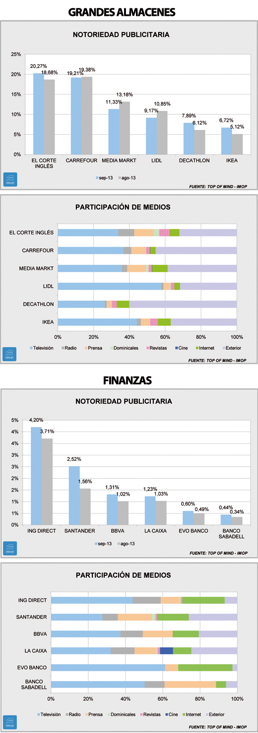 En ambos casos hay subidas y bajadas muy repartidas. En el primero, una ligera caída de El Corte Inglés viene acompañada de una muy fuerte subida de Carrefour, que gana más de 5 puntos y un puesto sobre septiembre de 2012, y se queda a solo un punto del líder. Caen por el contrario de manera importante Media Markt, Lidl e Ikea, más de 3,5 la primera y más de 2 puntos las otras dos. Sube ligeramente Decathlon.