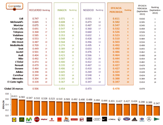 • Lidl continúa liderando el ranking de eficacia percibida, destacando sobre todo en recuerdo, en el que se posiciona en primer lugar.
