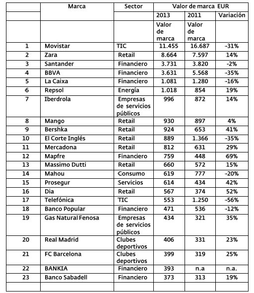 El informe indica que un 60% de las marcas han incrementado su valor y que un 14% de las marcas son nuevas. Las incorporaciones son las globales Zara (#02) y Santander (#03), Bankia (#22), San Miguel (#26), Jazztel (#29) y Mutua Madrileña (#30).